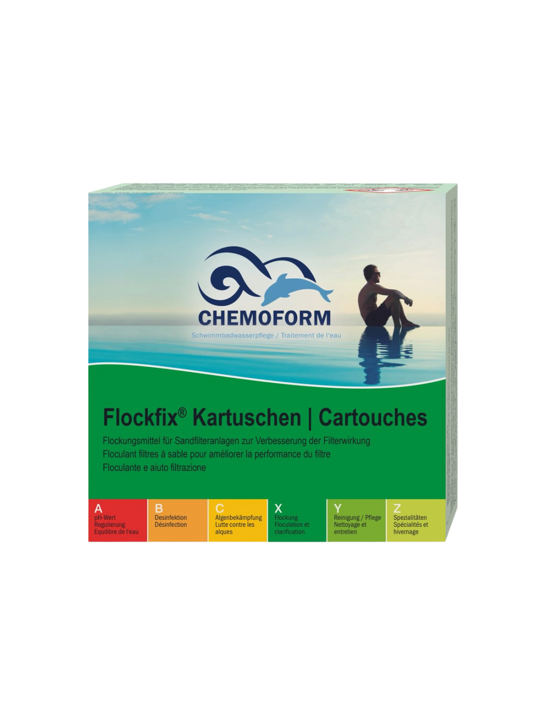 Floculant longue durée en cartouches de 125 g. Piège les particules en suspension, Forme très rapidement de gros flocons retenus par la masse filtrante.